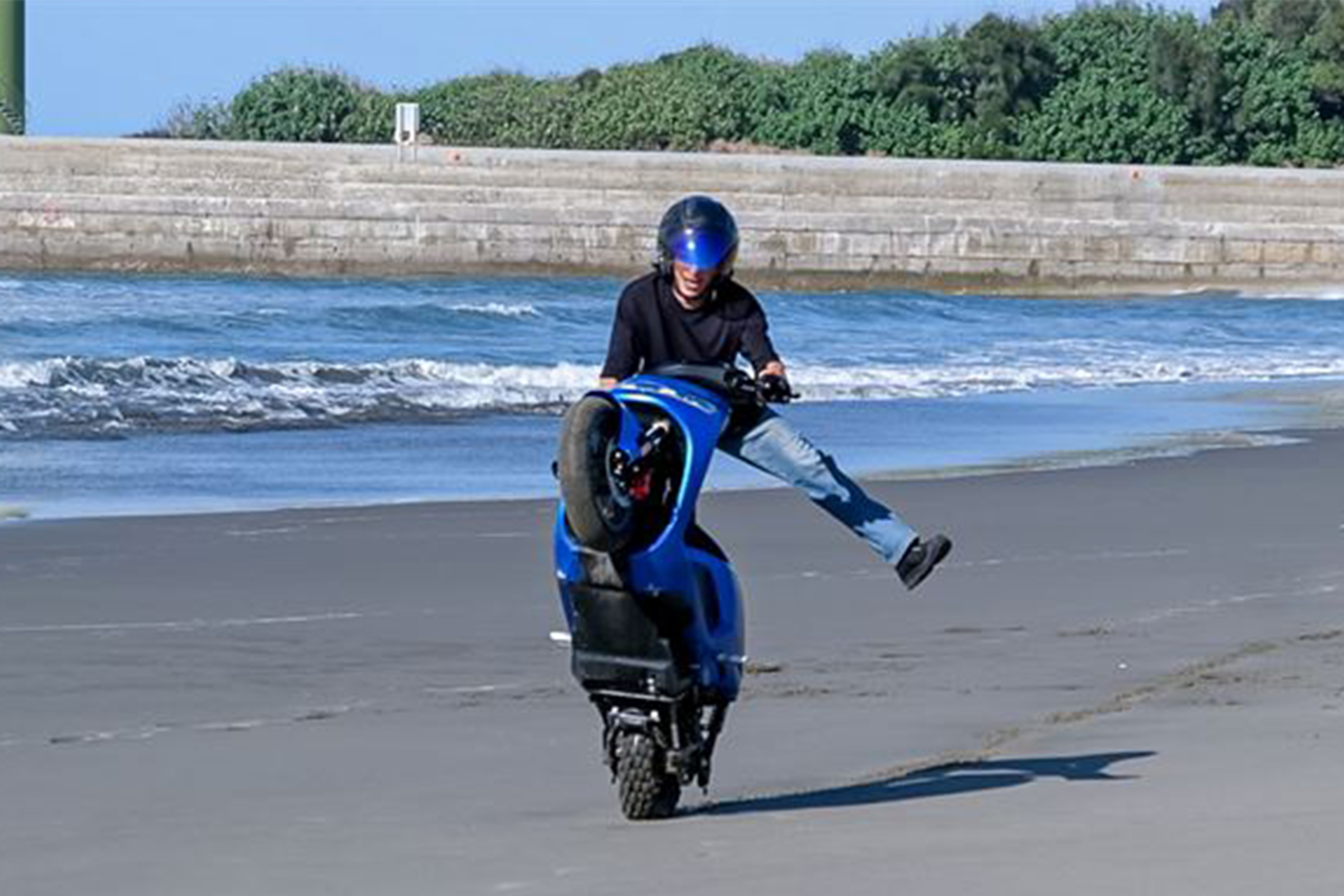 假日的騎士沙灘節還有一個很瘋狂的表演活動,知名特技車手安倍優以IONEX S7R高性能電動車,在輕檔車大會師現場表演高難度、精彩的特技技巧展示,現場吸引眾多車友關注,這樣的搭配也跳脫以往電動車安謐的既定印象,安倍優與S7R都在各自的領域挑戰眾人想法,不斷突破自我!
