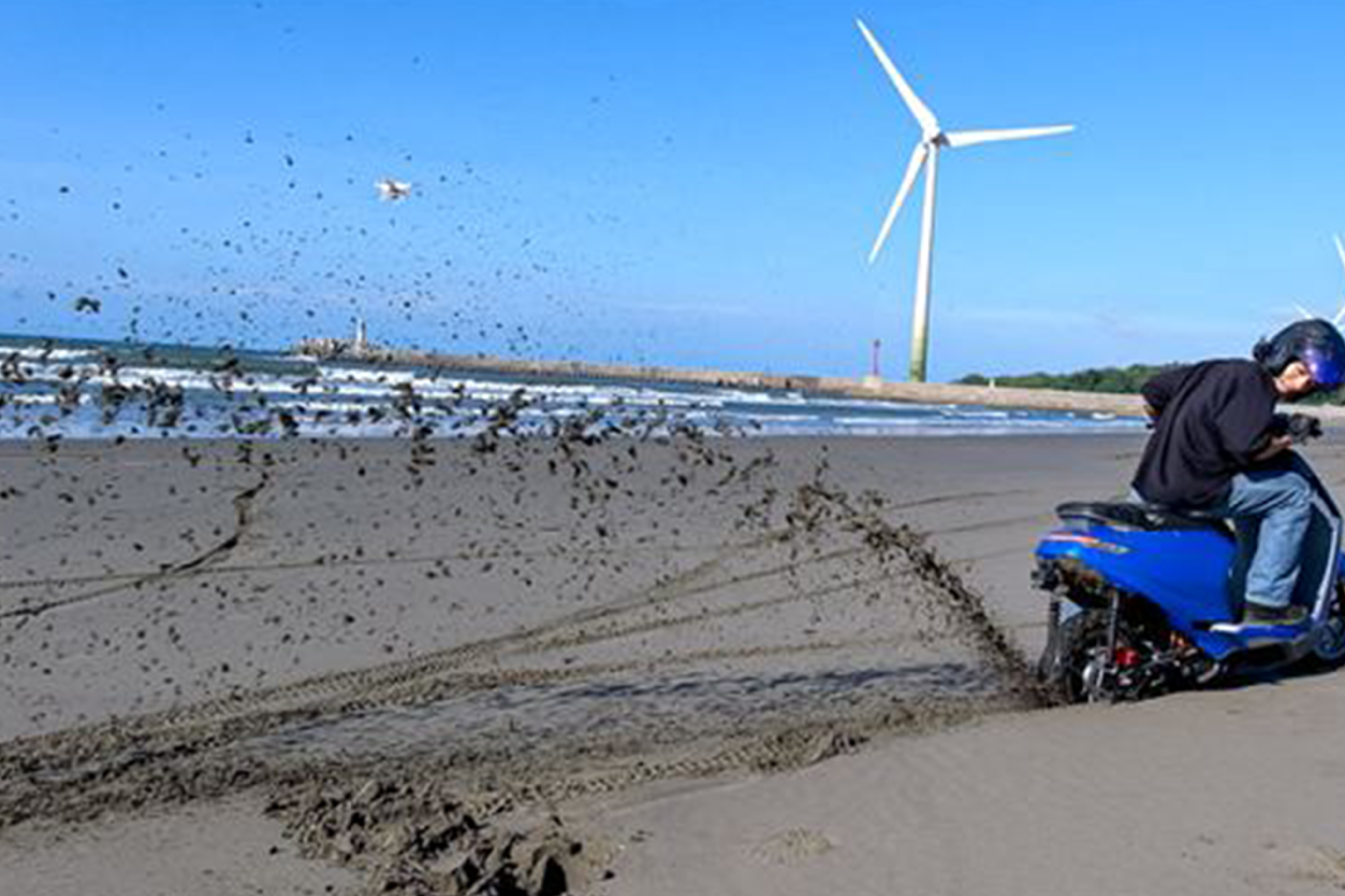 玩心大開的安倍優也在沙灘上玩起後輪噴砂的歡樂秀,利用後輪原地大扭力高速旋轉將地面的沙土向後噴出,拉出一幕幕的沙幕。