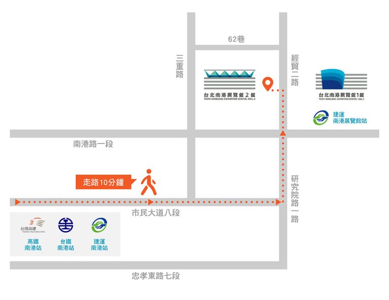 - 搭乘捷運「板南線」於「南港展覽館站」下車,並於1號出口離站沿左側至南港1館 ; 沿右側「南港2館地下連通道」至南港2館