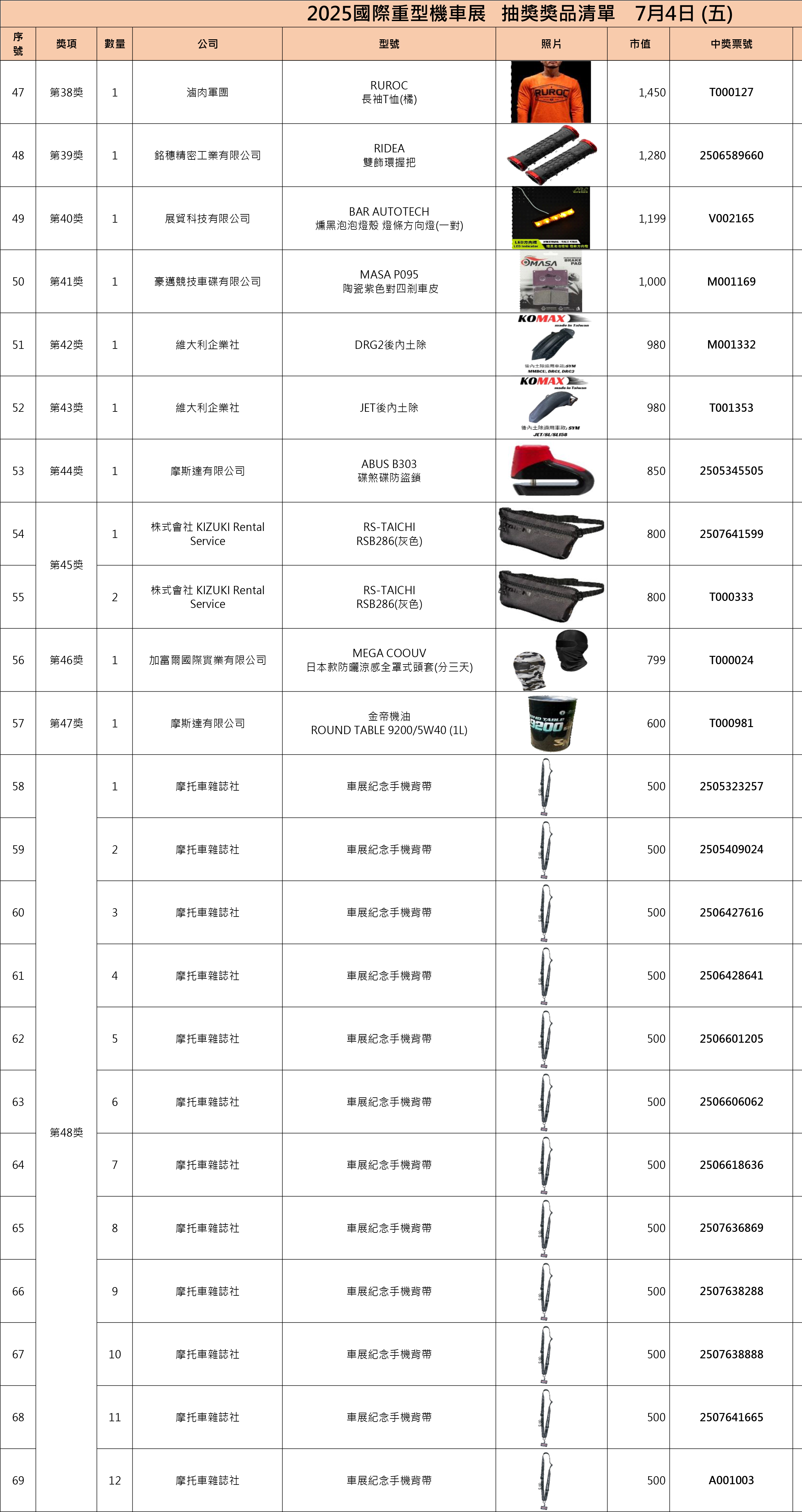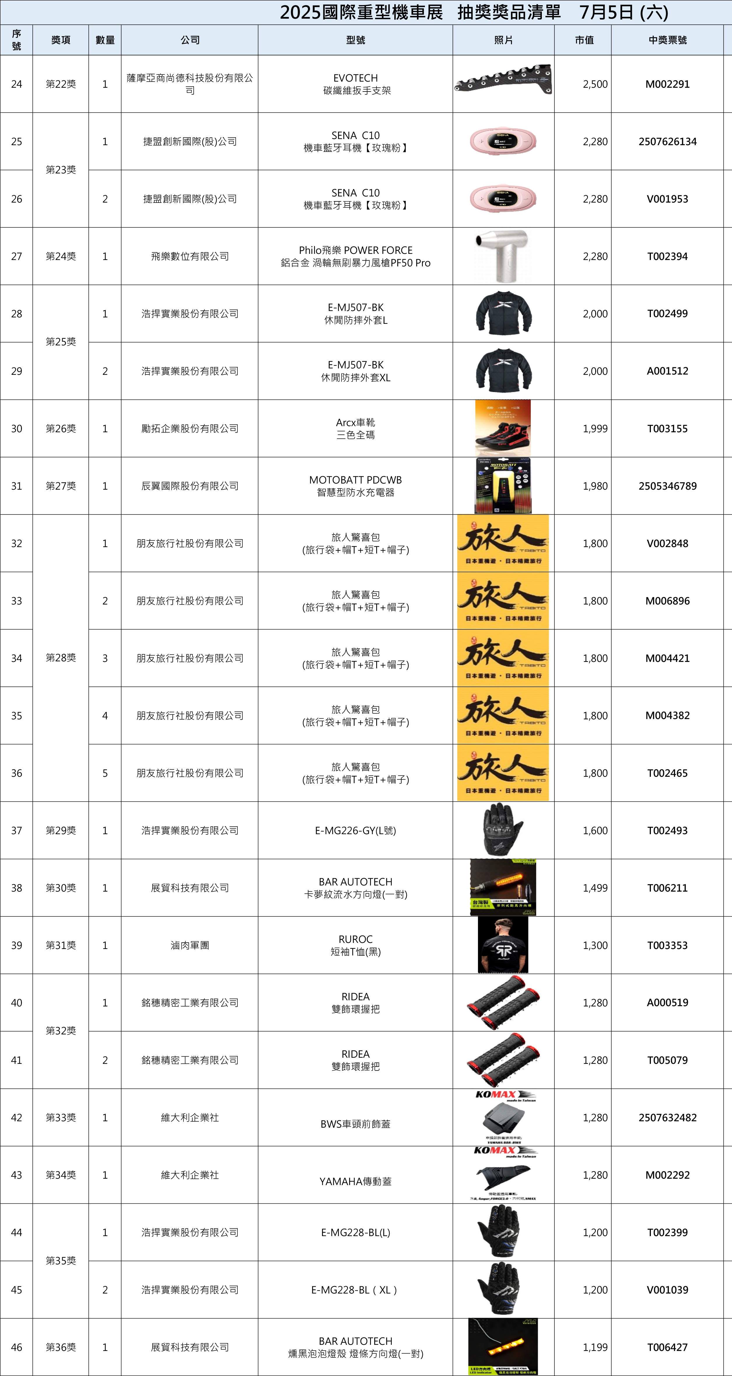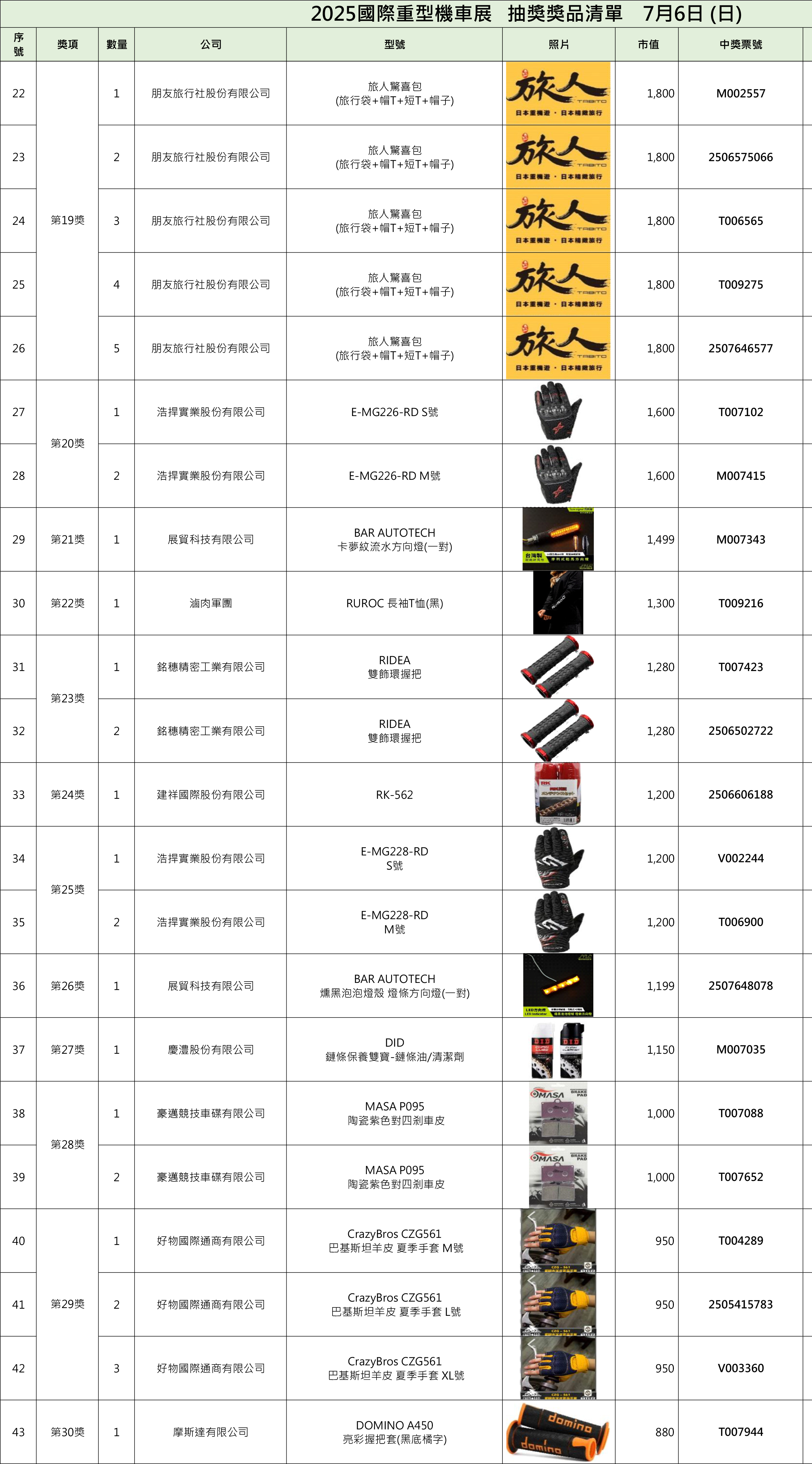 2025國際重型機車展中獎名單On4 7 月, 2025In2025, 2025, 歷屆中獎名單, 獎項清單 一、現場中獎者須出示摸彩券存根聯,經核對無誤後,憑抽獎工作人員註記後將發放獎品兌換券,請憑證至該提供之展商處領取。二、中獎人如未能在現場領取獎品兌換券,則於展後至官網比對無誤後請至摩托車雜誌社或將中獎存根聯及身份證影本掛號寄至主辦單位,經核對領取人身份資料無誤後,將發放之該獎項之獎品兌換券,得獎人請持兌換券自行至該提供之廠商指定店面領取。即日起至7月18日前中獎人須完成兌獎券兌換,逾期視同自行放棄得獎權益,事後不得要求補發。三、若有貨物寄送及郵資相關問題一律由中獎人自行負擔(請與授獎廠商協調代寄事宜),主辦方概不負責。 中獎查詢 Share your love 上一 文章 Honda Motorcycle國際重型機車展五大車系磅礡巨獻 下一 文章 2025國際重型機車展第二天中獎名單 相關文章 四缸靈魂回歸街道!CB1000F 登場,Honda 把賽道動力變成日常樂趣30 12 月, 2025 2025日本移動展 科技概念新車亮相12 11 月, 2025 2025國際重型機車展車友滿意度調查14 8 月, 2025