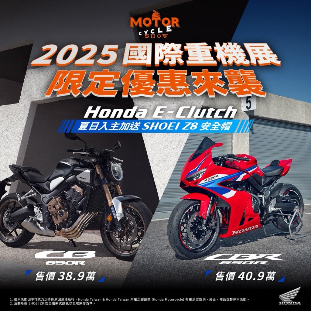 Honda Motorcycle國際重型機車展五大車系磅礡巨獻On18 6 月, 2025In網站首頁文章 車展限定購車優惠同步登場(官方新聞稿) Honda Taiwan秉持「The Power of Dreams – How we move you.」的品牌精神,致力於提供卓越的產品與服務,豐富的產品線讓各式風格的騎士皆能享受騎乘的樂趣,全台顧客期待已久的國際重型機車展即將登場,Honda Motorcycle展區將以五大車系為主軸,展出多款新改款車種以及全新車款,並將有神秘嘉賓親臨現場,共同感受二輪熱血氛圍!為了響應二輪年度盛會,於今日開始至七月底推出多項限定購車優惠,讓您輕鬆入手夢想之車! Honda Motorcycle 展區以旗下五大車系為核心,全機種展出豐富的產品線與各項精美人身部品,滿足不同風格騎士的多元風格,不論是悠遊壯闊的Cruiser車系、簡約俐落的Street車系、熱血賽道基因的Sports車系,征服未知的Adventure車系、都會時尚的Urban車系,各大分區將展示Honda Motorcycle的獨特魅力與最新科技,同時,多款備受市場期待的新改款機種也將在展會中亮相,無論您是哪種風格的騎士,都能在找到屬於您的夢想之車。此外,特別邀請了對於二輪生活有著滿滿熱情的神秘嘉賓於展覽期間親臨 Honda Booth聲援,並與現場車迷互動,共同點燃對二輪世界的無限熱情。為了響應二輪年度盛會並讓顧客能夠更無負擔地入主夢想車款,凡購買指定車款,即享72期、零頭款、零利率優惠,再加碼贈送三萬元購車金,無論是添購人身用品、車輛部品,都能更加輕鬆擁有個人風格。引領科技潮流,搭載劃時代E-Clutch的 CB650R E-Clutch 與 CBR650R E-Clutch,提供更便捷、順暢的換檔體驗,讓騎乘樂趣更上一層樓,夏日入主再送Shoei Z-8安全帽,讓您在享受先進科技的同時,也能擁有頂級安全防護。廣受好評的冒險車款XL750,運動強化版(含水箱防護網、前防護桿、支架、引擎防護桿、引擎下護板、護弓支架、快速換檔套件 價值:60,202) 運動化的外觀與配備,熱血風格全面進化,售價:488,000 ; 騎旅機能版(含專屬側箱組、專用支架、鋁合金面板 價值:45,860)以及都會潮流車款CL Street:29.8萬加贈馬鞍包(價值9,370),兩款車款除享72期,零頭款、零利率之外,再送三萬元購車金,讓您在探索未知或是享受城市騎乘時,都能擁有更多獨一無二的騎乘體驗。無論您是尋求日常通勤的夥伴,還是獨具一格的冒險者,Honda Taiwan的各款車型都將為您帶來移動的喜悅,即刻前往全台經銷據點訂購心儀車款! 車款優惠活動項目說明 「2025國際重機展限定優惠來襲」指定車款享72期、零頭款、零利率再送三萬元購車金訂購CB650R E-Clutch、CBR650R E-Clutch 並完成領牌即贈Shoei Z-8安全帽XL750 Transalp 運動強化版 : 488,000 含水箱防護網、前防護桿、支架、引擎防護桿、引擎下護板、護弓支架、快速換檔套件(總價值:60,202)XL750 Transalp 騎旅機能版 : 478,000 含專屬側箱組、專用支架、鋁合金面板 (總價值:45,860)CL STREET:29.8萬 贈送馬鞍包 (總價值:9,370) 以上兩款車款,除享72期、零頭款、零利率,再送三萬元購車金 Share your love 上一 文章 車廠介紹---光陽/ionex *攤位編號:C4-01~40* 下一 文章 2025國際重型機車展中獎名單 相關文章 EICMA米蘭車展 2026年新車快訊13 11 月, 2025 2025日本移動展 科技概念新車亮相12 11 月, 2025 2025國際重型機車展車友滿意度調查14 8 月, 2025